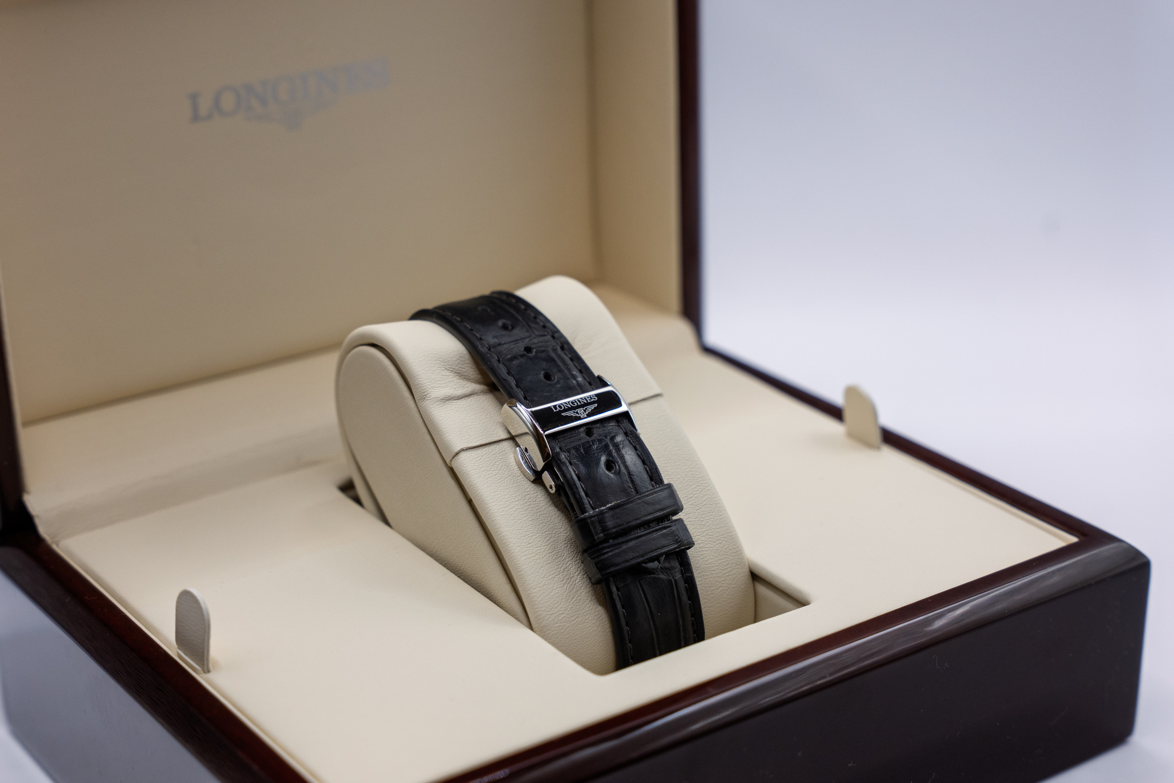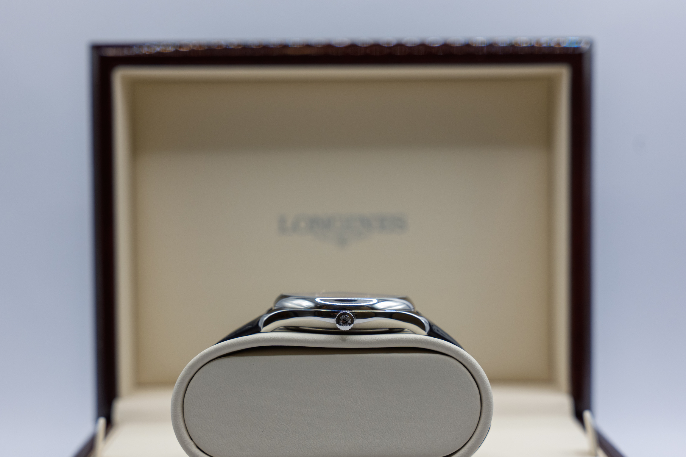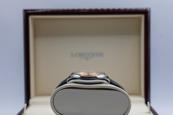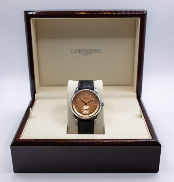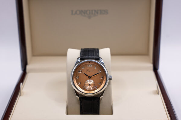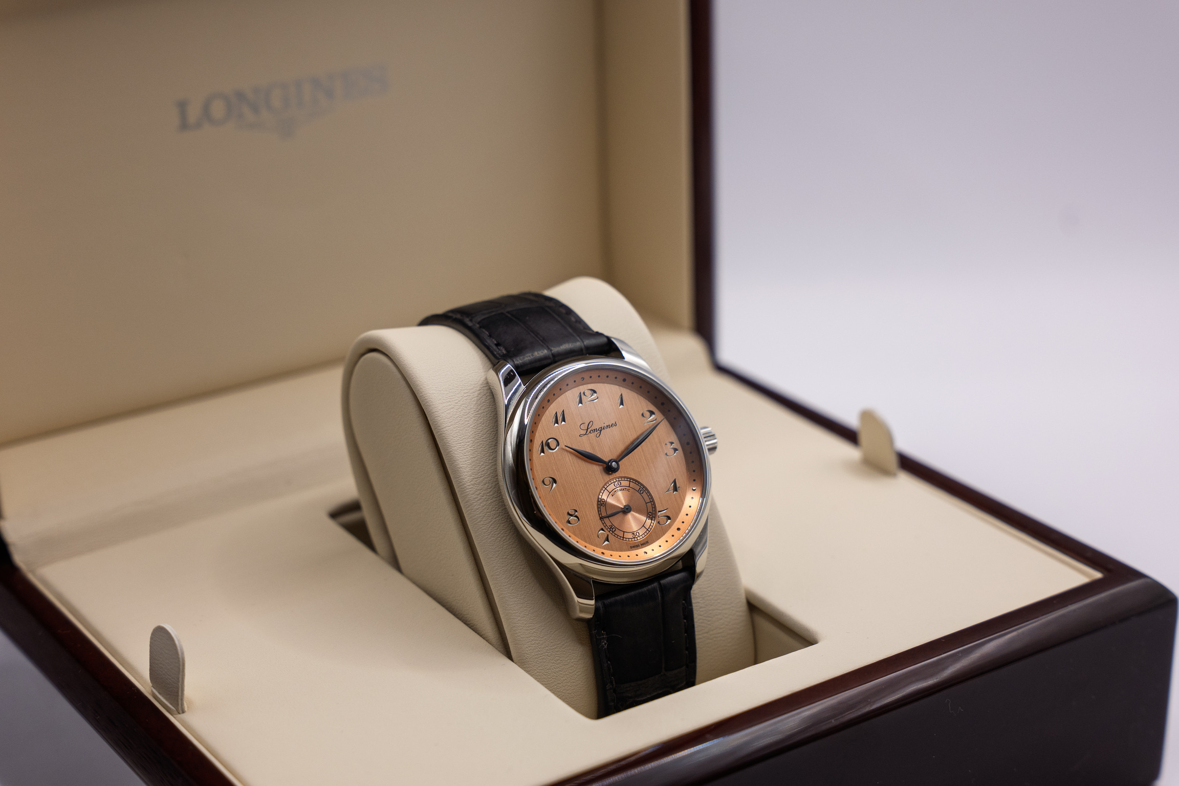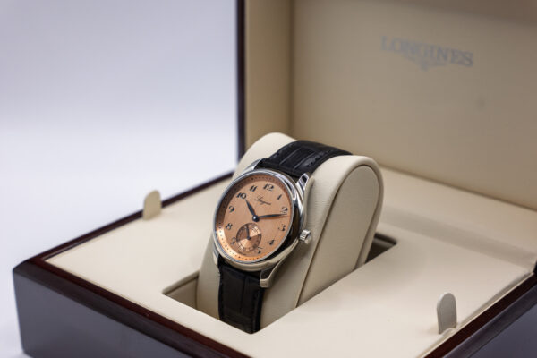 Selger et elegant eksemplar av Longines Master Collection med ettertraktet salmon-farget tallskive og skinnrem. Uret ble kjøpt nytt i september 2024 hos autorisert norsk forhandler og leveres komplett med original boks, garantikort og dokumentasjon. Klokken fremstår som ny, uten tegn til bruk.