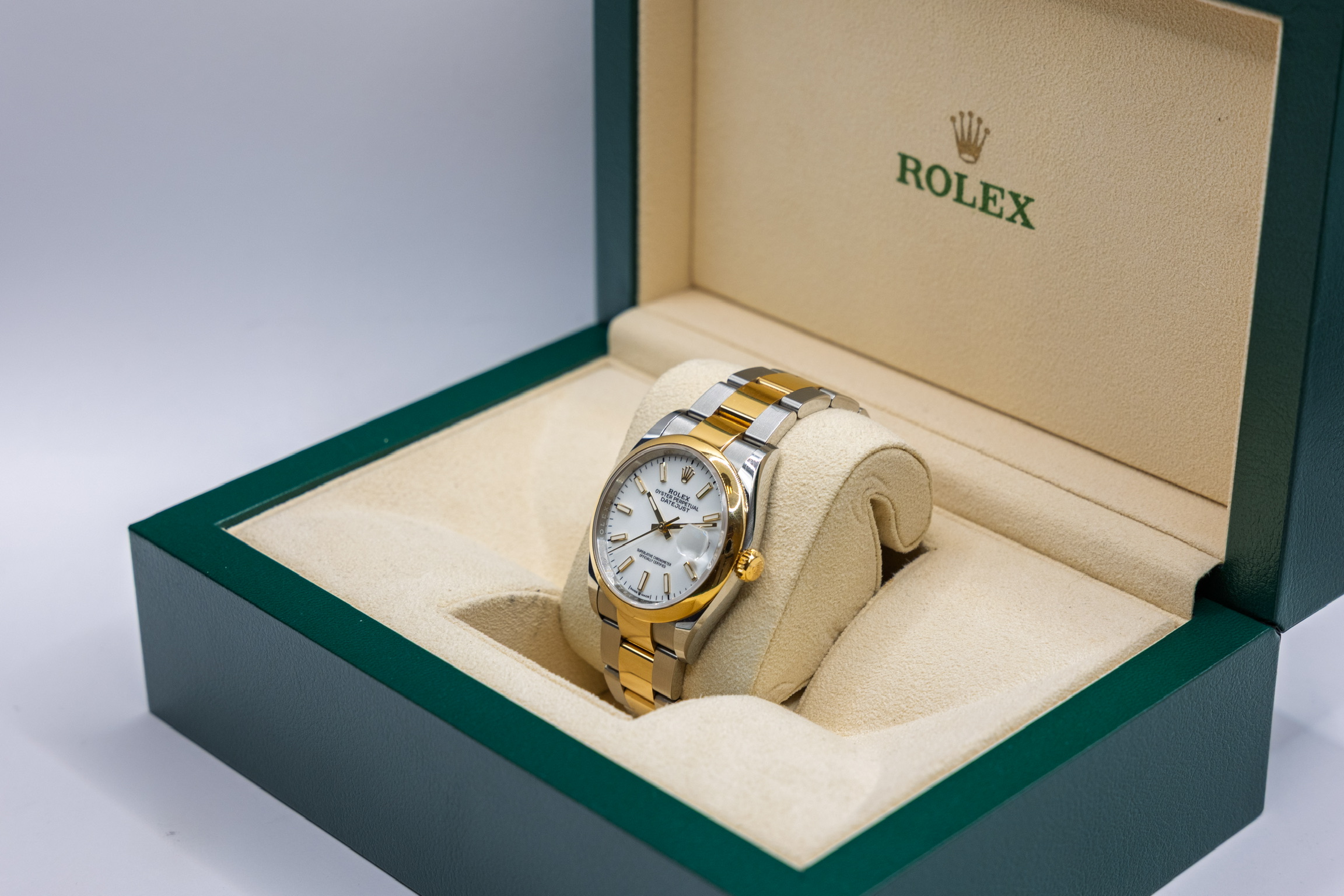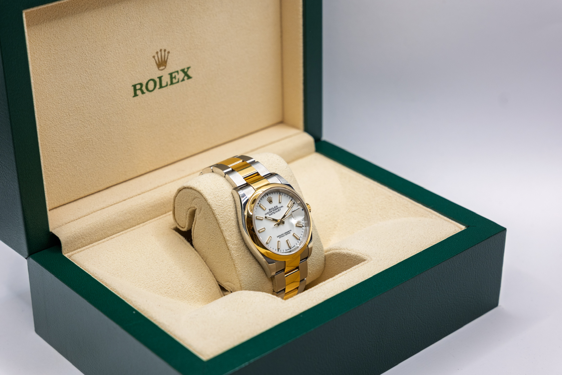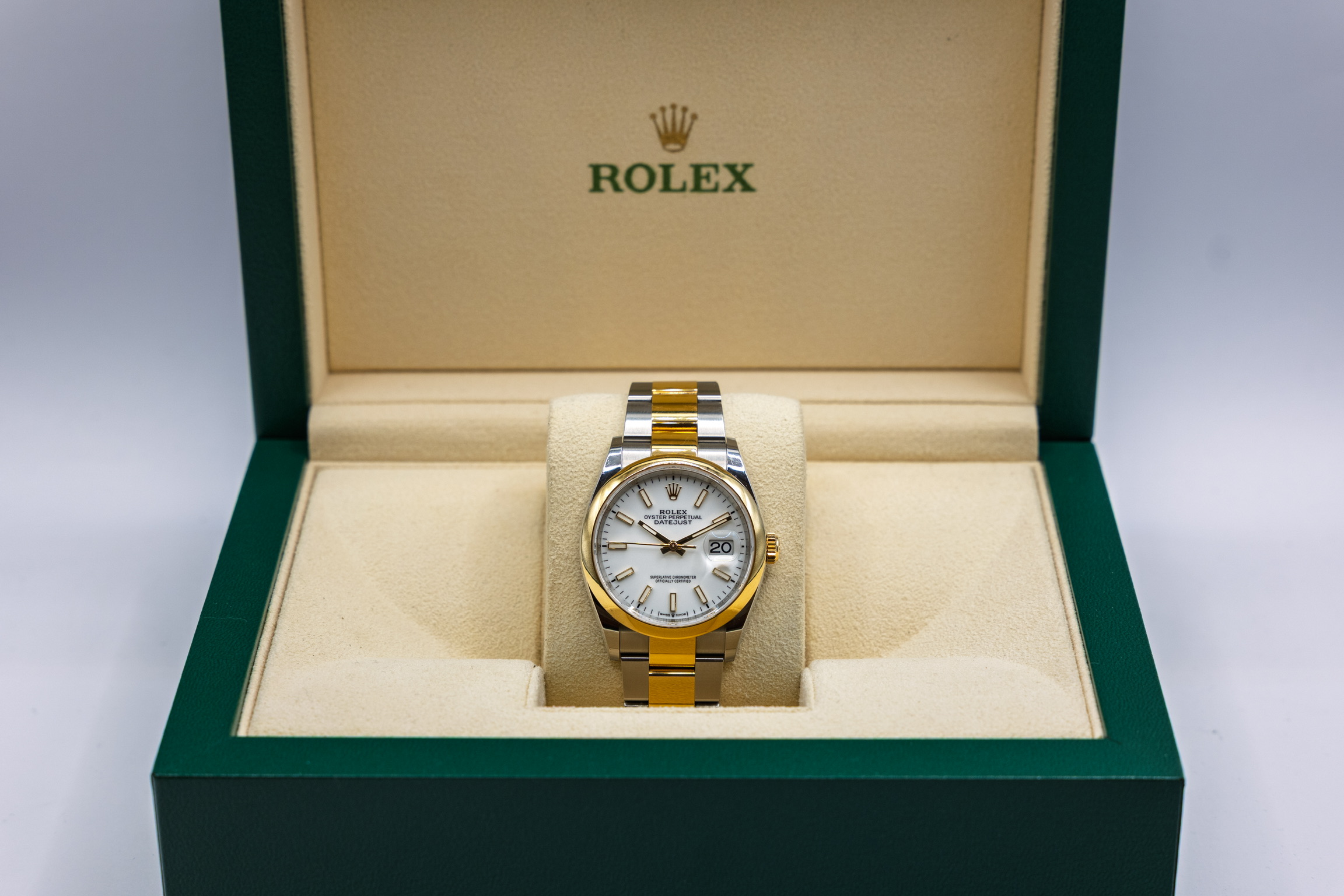 Ref. 126203 kombinerer det slitesterke Oystersteel med edelt gult gull, og drives av det moderne Caliber 3235 – et presist og effektivt urverk kjent for høy pålitelighet og lang gangreserve. Resultatet er en elegant, solid og svært anvendelig Rolex som holder seg aktuell år etter år.