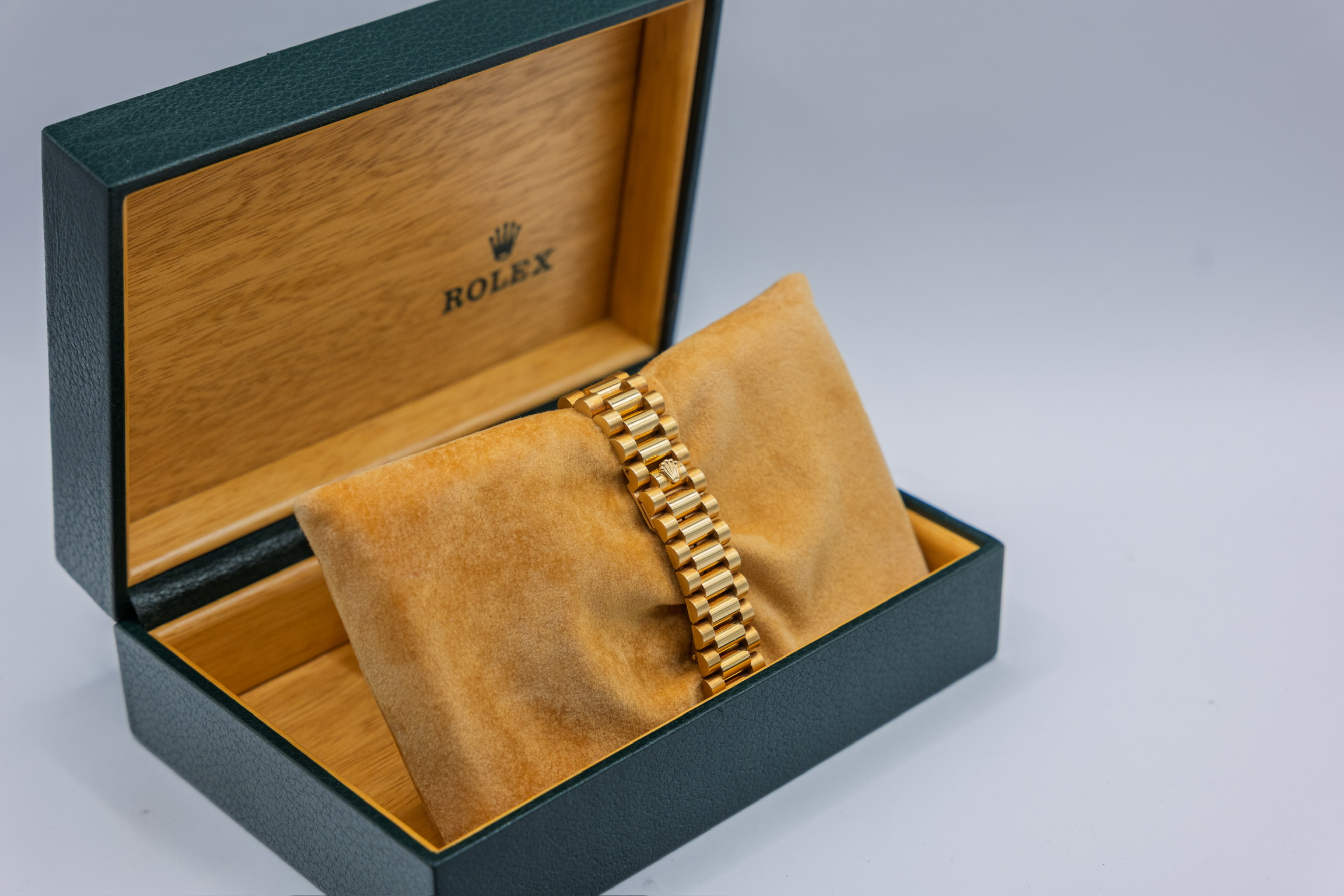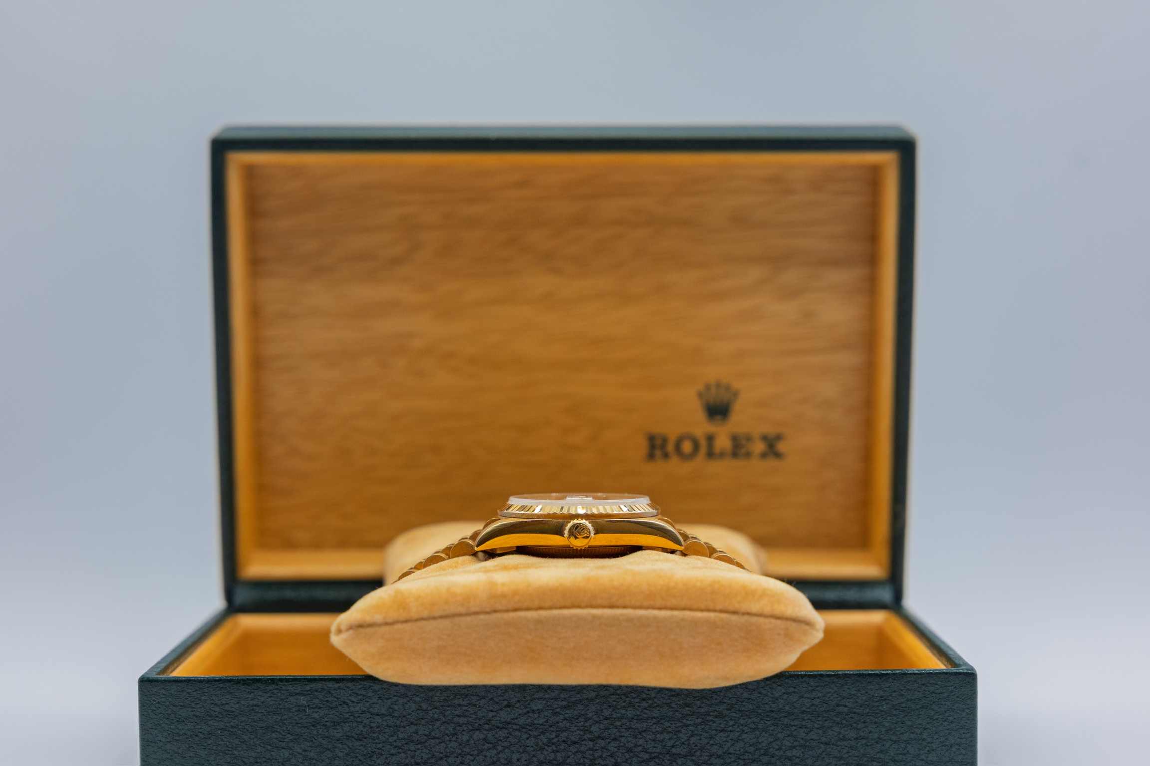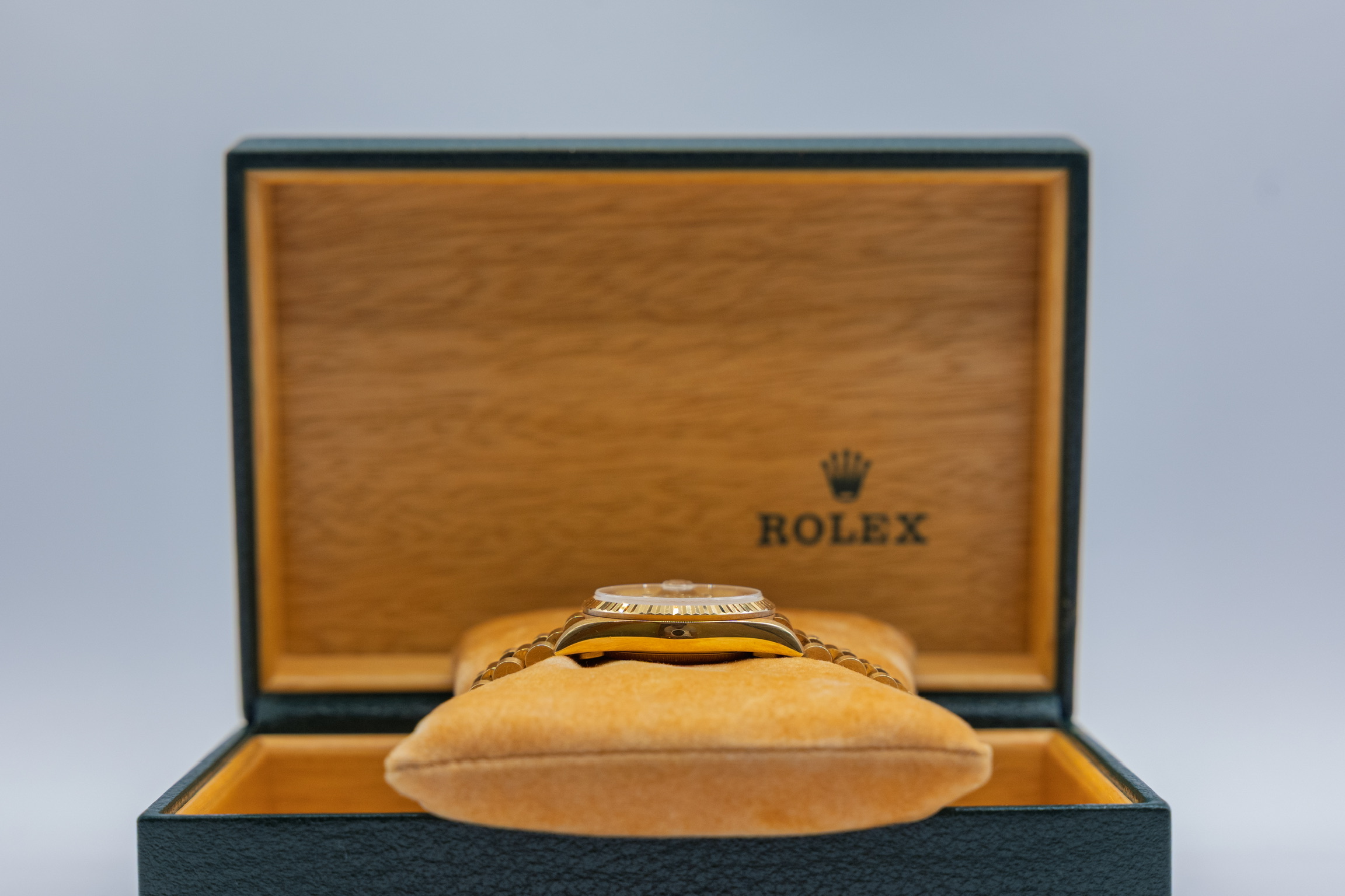 Vi tilbyr nå en helt eksepsjonell Rolex Datejust 31 i 18 karat helgull. Dette er et ur som har kun ligget i safe, og fremstår i strøken, nærmest urørt stand – helt uten bruksmerker.