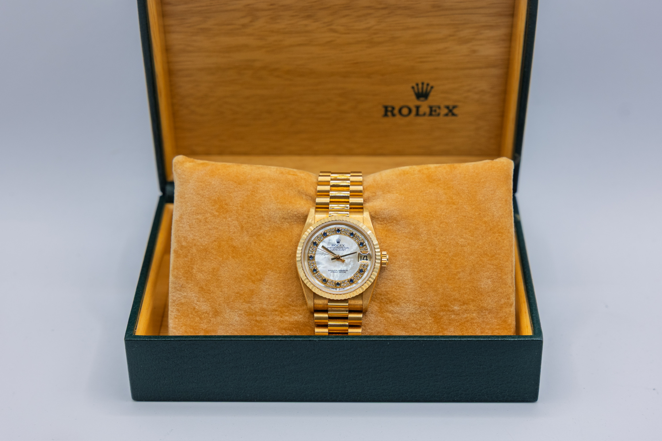 Klokken har en nydelig Mother of Pearl-skive med et eksklusivt og levende fargespill. Skiven er utsmykket med 50 diamanter samt 11 safirer, som gir klokken et sofistikert og luksuriøst uttrykk – elegant, tidløst og svært ettertraktet.