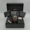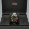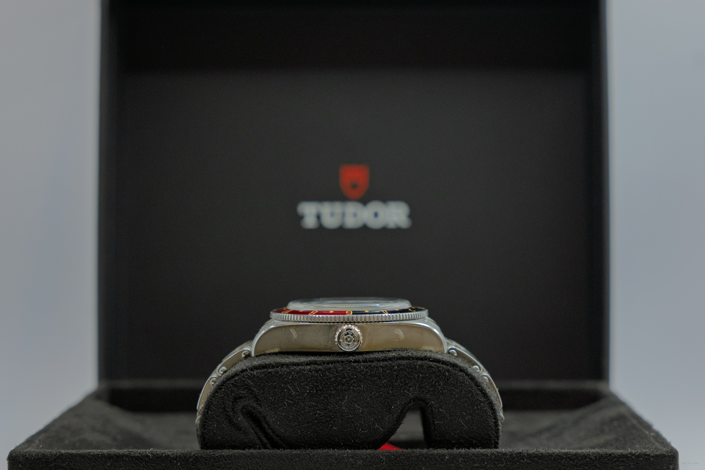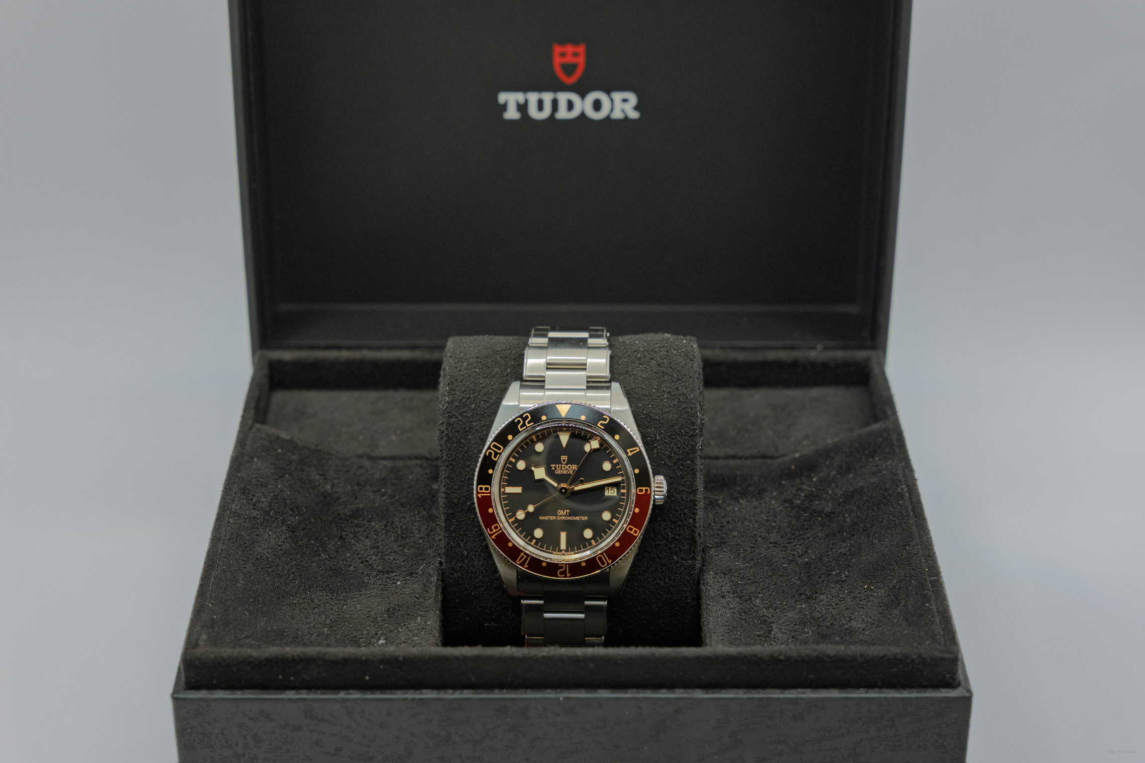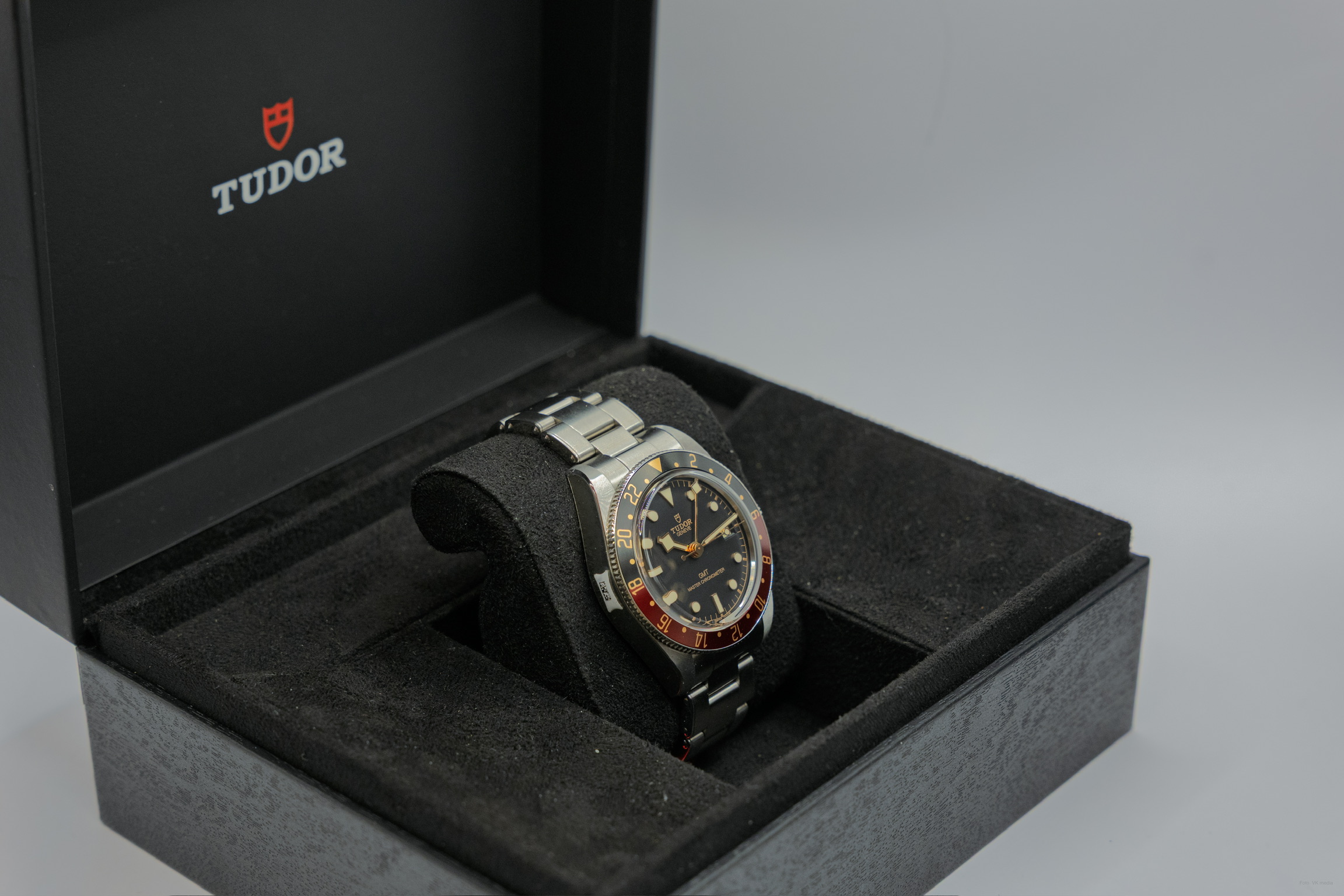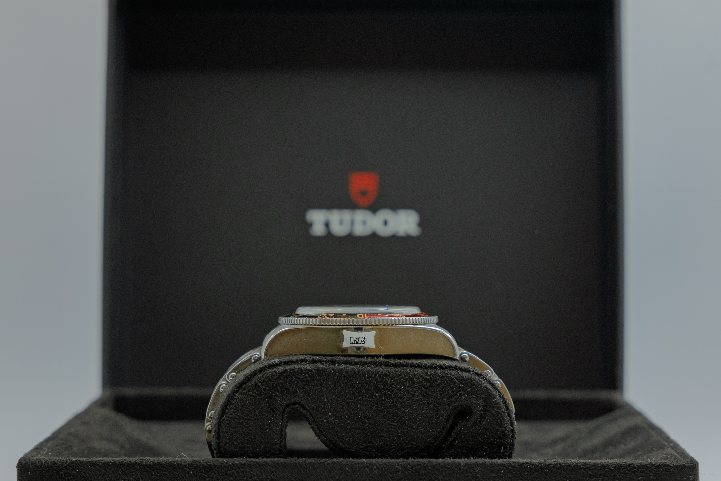 Modellen har den klassiske rød/sorte GMT-bezelen – ofte omtalt som “Coke” – kombinert med Tudors robuste Black Bay-design. Dette er en moderne GMT-klokke med høy kvalitet og svært solid konstruksjon.