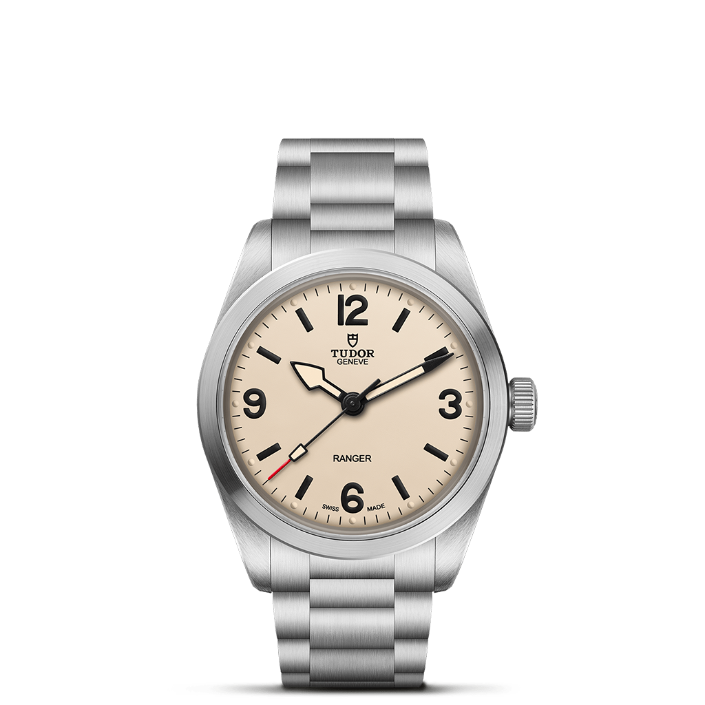 36 mm stålkasse. Beige kuppelformet tallskive.